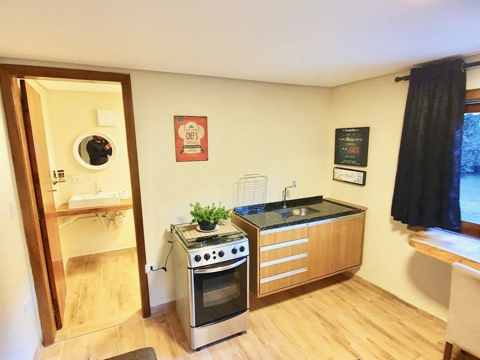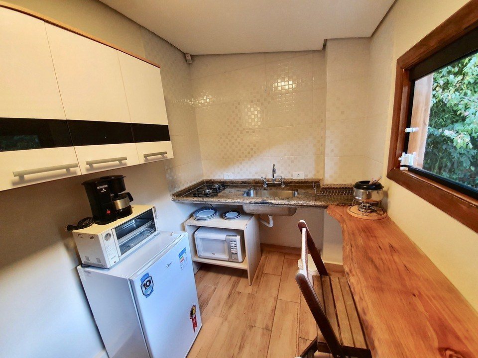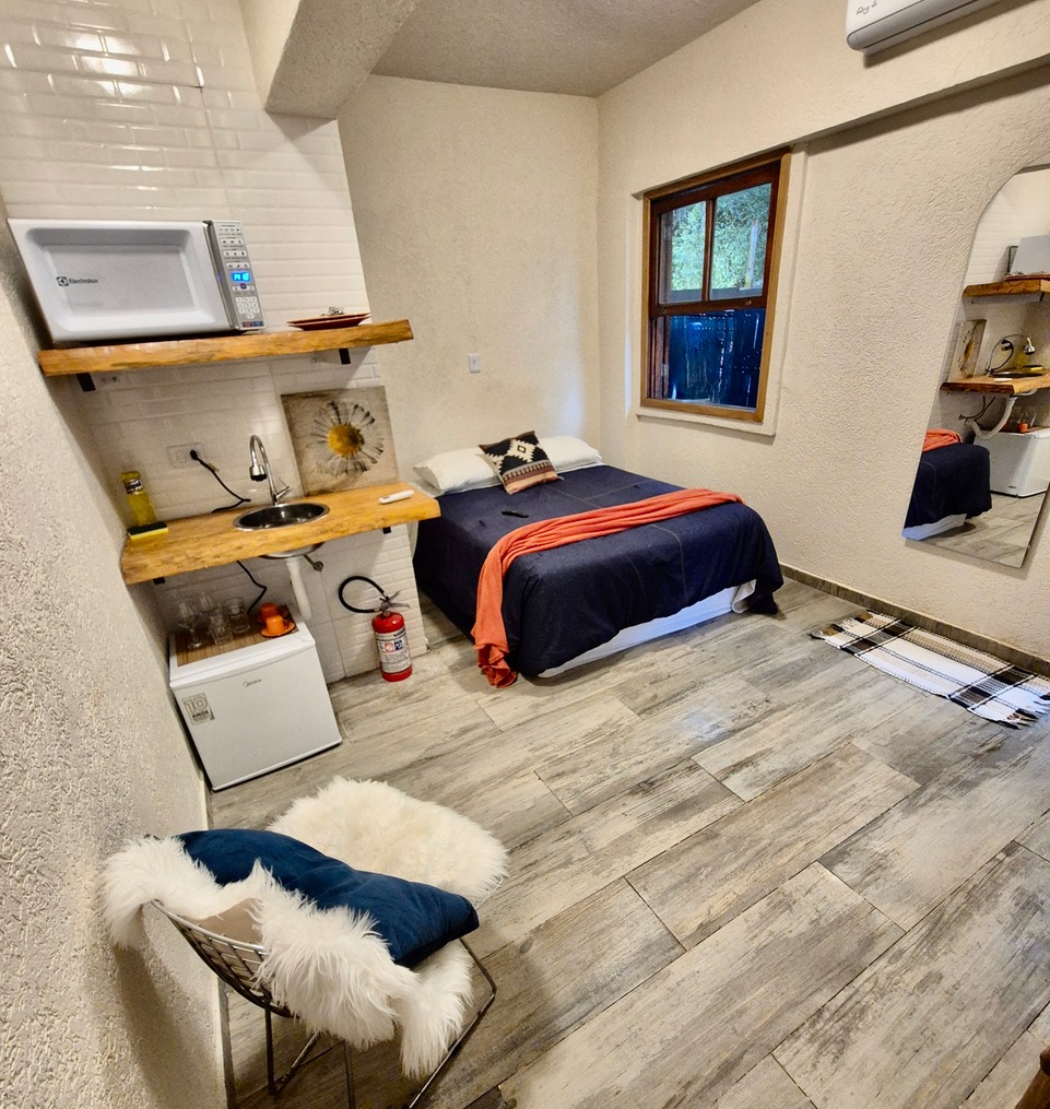 Ambiente dois : Pequena Sala com cozinha completa e vista para o jardim, frigobar, wi-fi, smartTV, ar-condicionado, sistema inverter quente e frio no quarto, banheiro completo, linda vista do jardim., cozinha completa com fogão, microondas, mini geladeira, utensílios básicos de cozinha,