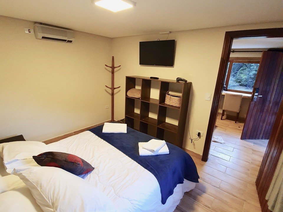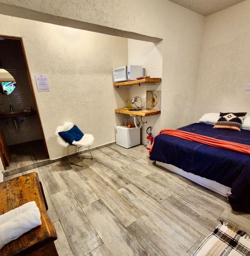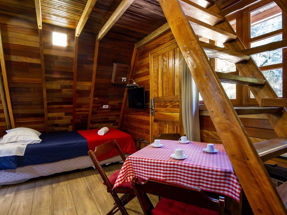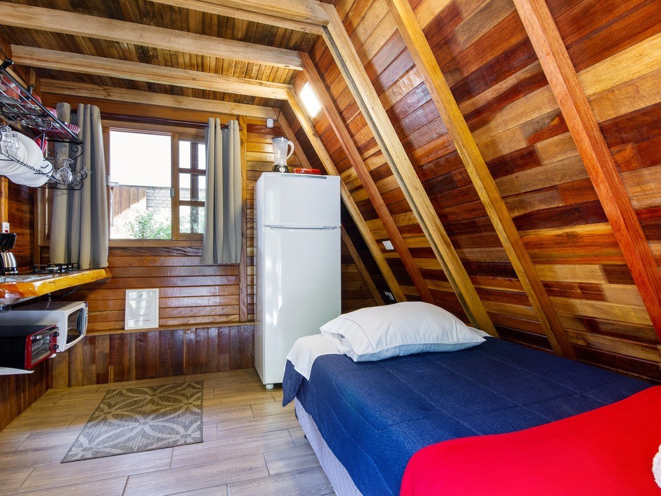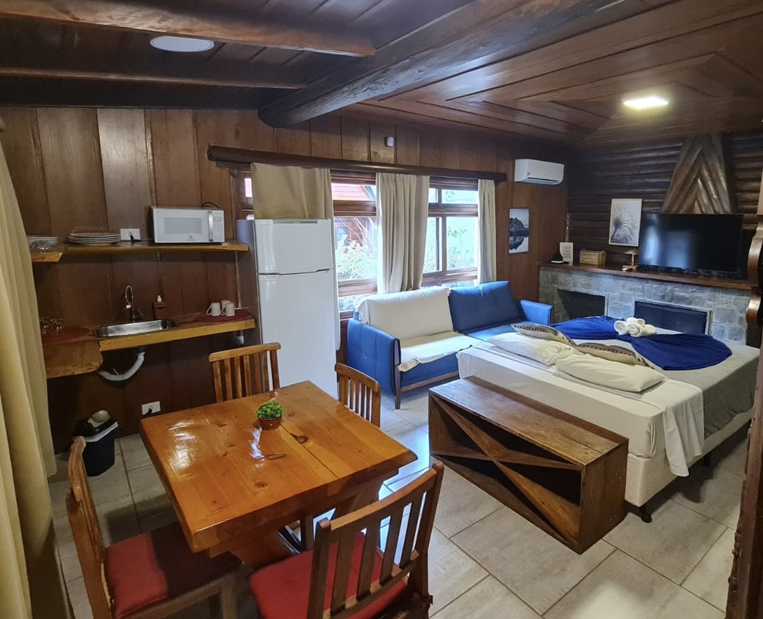 - Quarto com lareira e cozinha compacta com cama de casal (Queen) e uma de solteiro ( quando reservada para 3 pessoas )