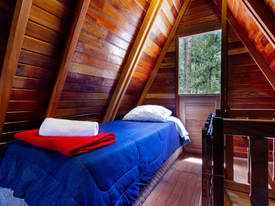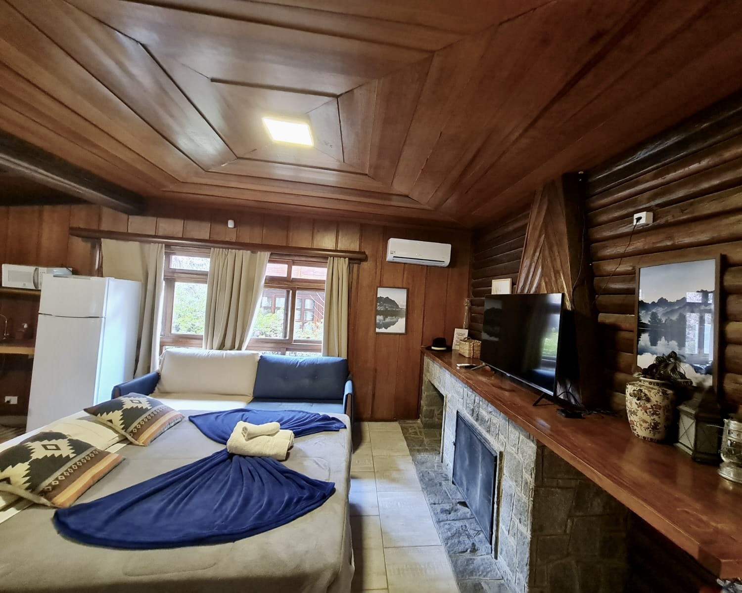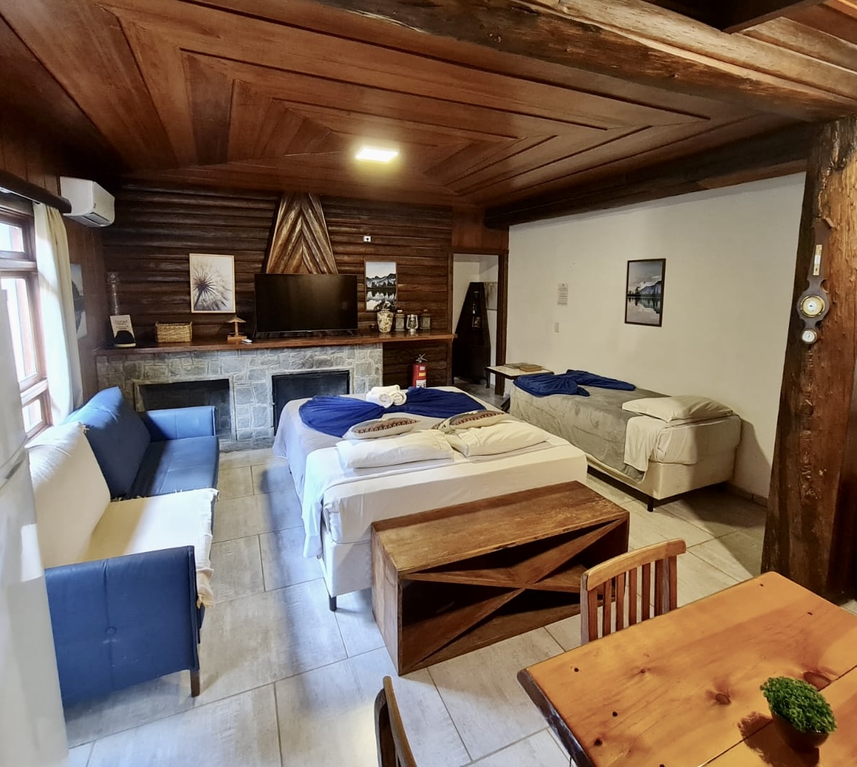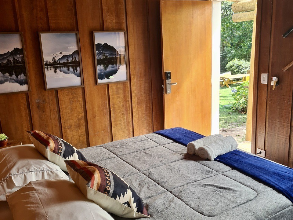 - Quarto com lareira e cozinha compacta com cama de casal (Queen) e uma de solteiro ( quando reservada para 3 pessoas )