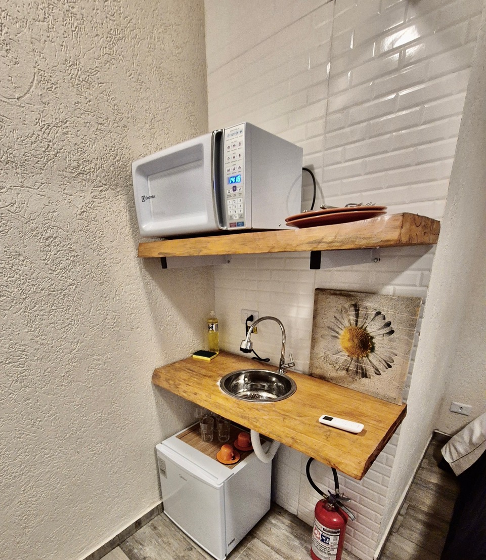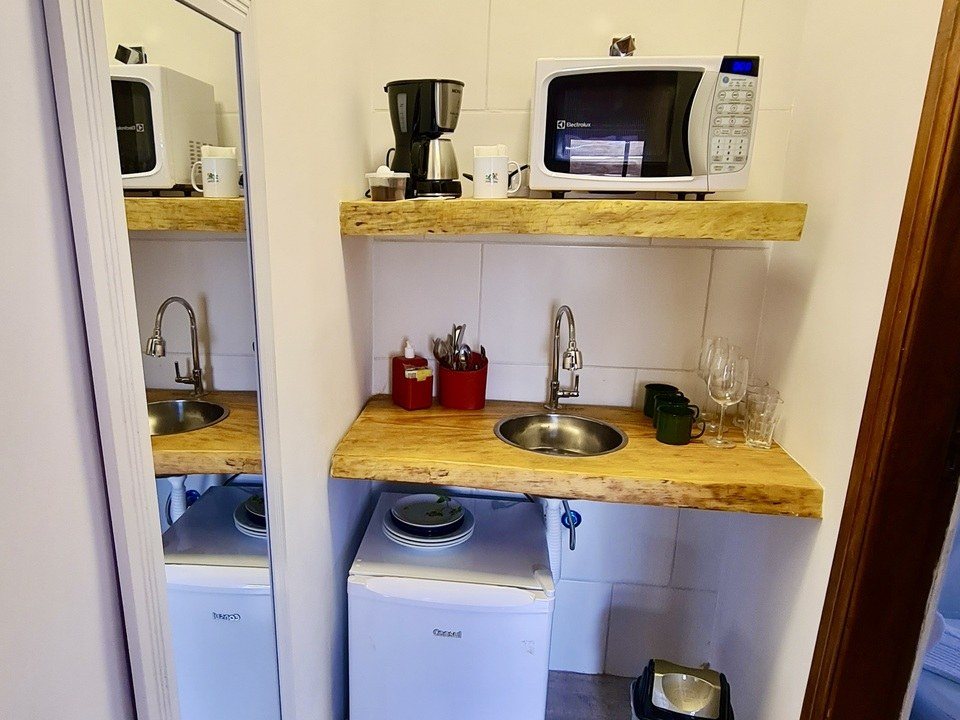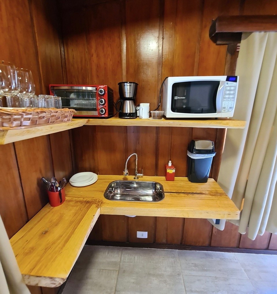 - Mini cozinha com pia, microondas, taças de vinho , pratos, copos e utensílios ( não há fogão ou panelas )