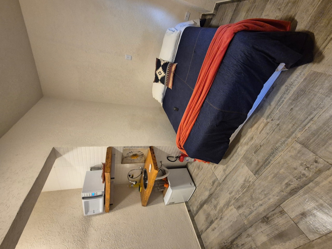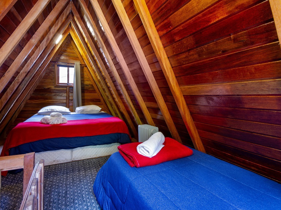 - Um quarto no andar superior com uma cama de casal (queen) e uma de solteiro. Junto a sala / cozinha compacta , há também uma cama de solteiro